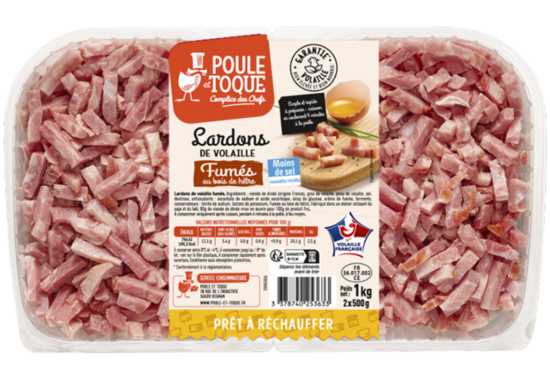 Des lardons de volaille garantis origine France tendres et riches en goût soigneusement fumés au bois de hêtre. Poule et Toque vous propose une alternative gourmandes aux lardons traditionnels !