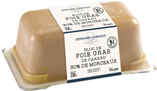 Un Foie Gras de canard Origine France avec une recette fondante et savoureuse résultant d’une émulsion de Foie Gras assaisonné et de morceaux représentant au minimum 30% du poids total du produit. Une présentation en terrine pour un tranchage facilité. 5/6 parts